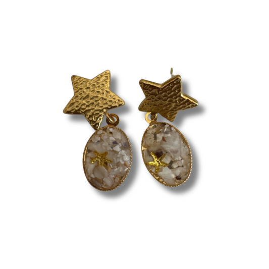 Boucles d’oreilles Etoile dorée & médaillon en Ostréalithe® – Nacre d’huître émaillée à froid