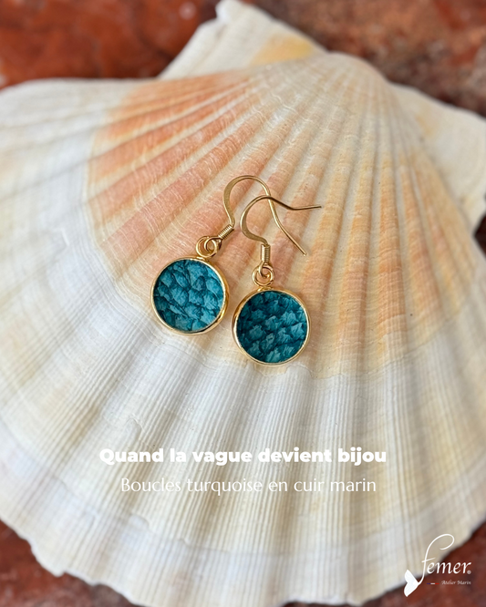Boucles d'oreilles pendantes, modèle "grain de sable"- cuir marin turquoise