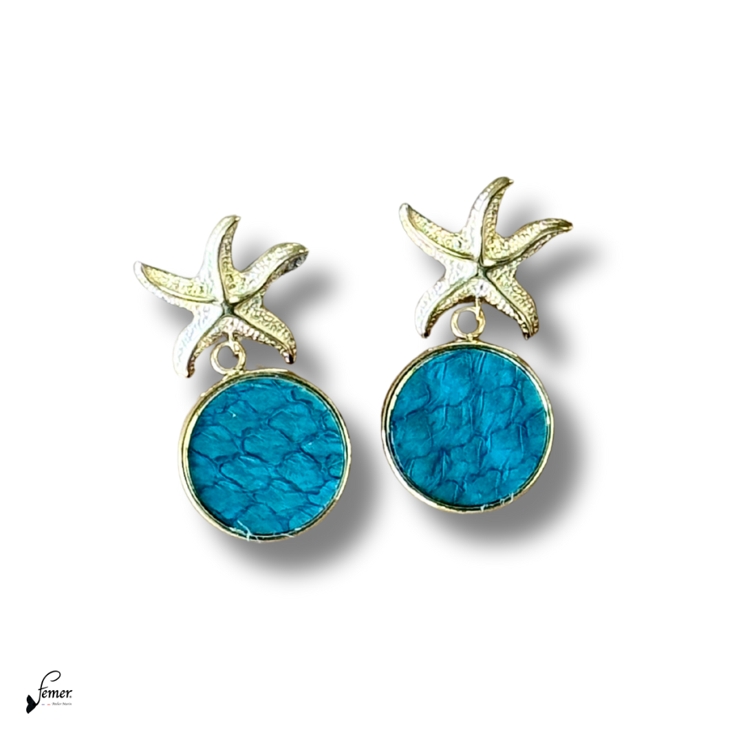 Boucles d’oreilles dorées à l’or fin en forme d’étoile de mer, rehaussées d’un médaillon en cuir marin FEMER – tanné et teinté artisanalement à la main.