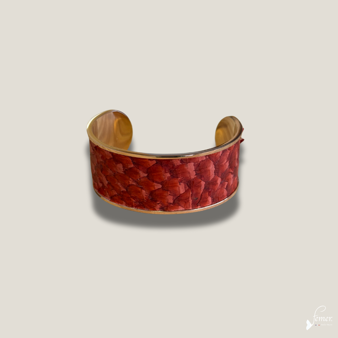 Le cuir marin est au cœur du savoir-faire de Fémer : chaque peau est issue de la valorisation de co-produits de la mer, dans une démarche d’upcycling local. Cette manchette unique révèle toute la singularité du mulet, un poisson typique du Bassin, au grain délicat et à la teinte naturellement vibrante.