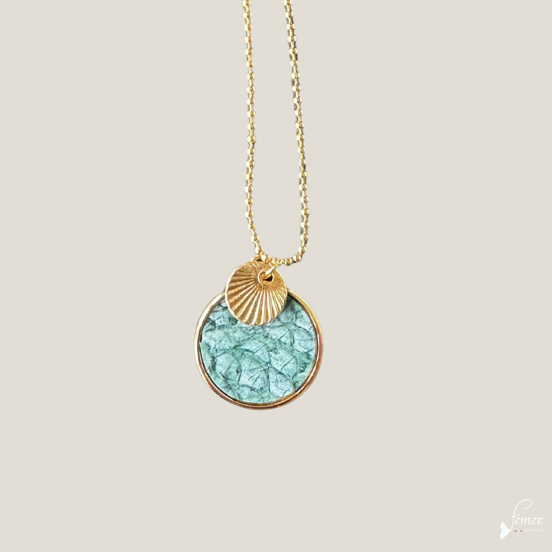 Sautoir modèle Salie-Sud en cuir marin Vert Algue – Médaillon 20 mm