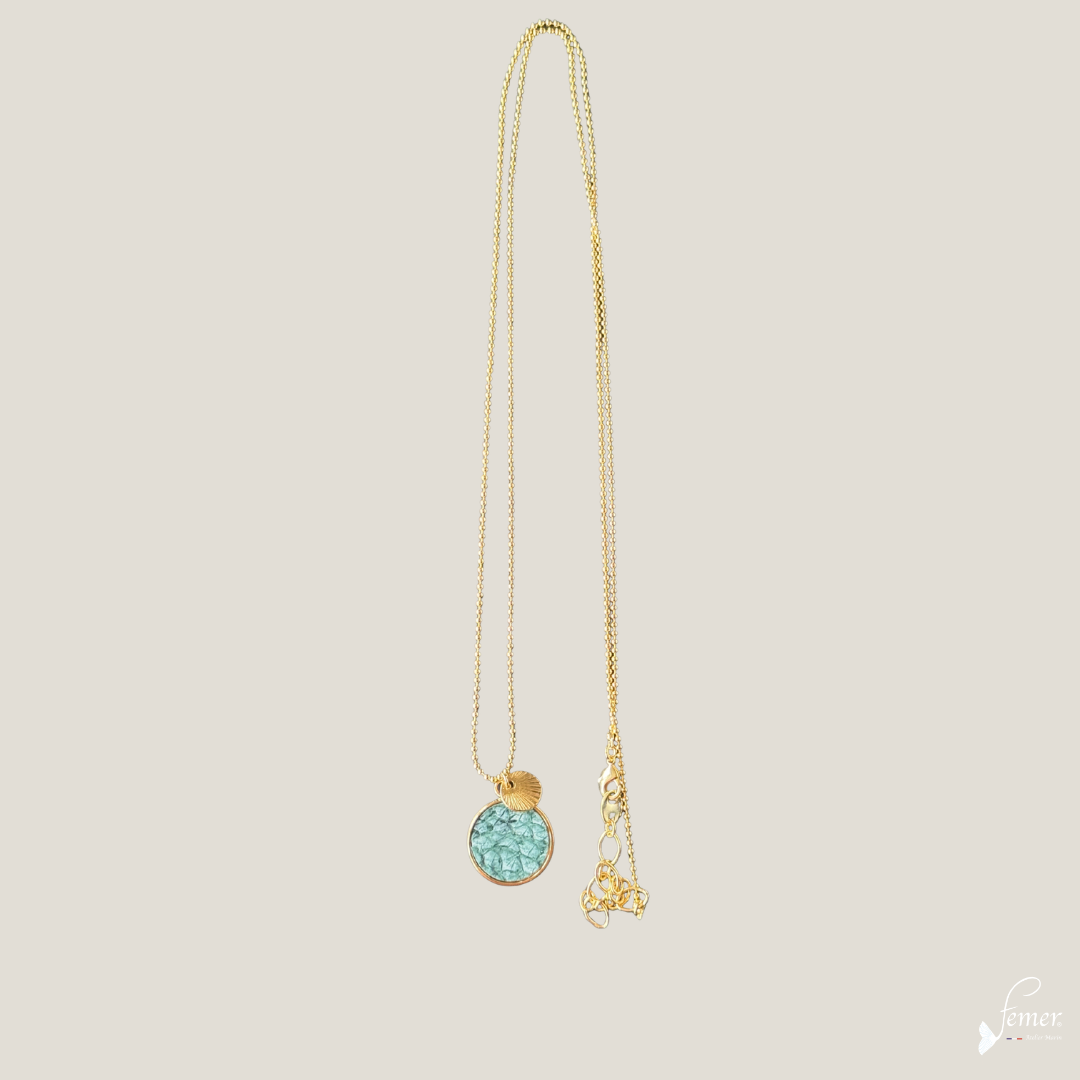 Son médaillon de 20 mm, monté sur une chaîne longue de 77 cm en acier inoxydable doré, offre un porté fluide et lumineux. Léger, minimaliste et confortable, ce sautoir accompagne aussi bien le quotidien qu'une tenue habillée. Chaque pièce est fabriquée à la main en France selon un savoir-faire artisanal unique.